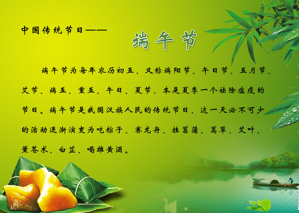 端午節(jié),又名端陽節(jié),重午節(jié),龍舟節(jié),正陽節(jié),浴蘭節(jié),天中節(jié)等,是中國民間傳統(tǒng)節(jié)日。端午節(jié),起源于中國,原本是上古先民擇“龍升天”吉日祭祀龍祖的節(jié)日。因傳說戰(zhàn)國時期的楚國詩人屈原在端午抱石跳汨羅江自盡,后來人們亦將端午節(jié)作為紀念屈原的節(jié)日;也有紀念伍子胥、曹娥及介子推等說法??偟膩碚f,端午節(jié)起源于南方吳越先民的龍圖騰祭祀 ,注入夏季時令“祛病防疫"風尚,把端午視為“惡月惡日”起于北方,附會紀念屈原等歷史人物紀念內(nèi)容,最后形成如今端午節(jié)文化內(nèi)涵。